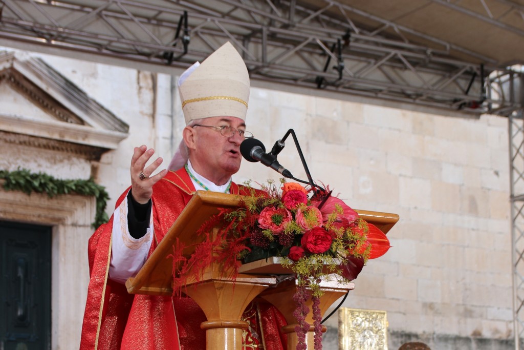 Spomenuo je kako se ove godine obilježava 1000 godina od dolaska relikvije glave svetoga Vlaha u Dubrovnik te istaknuo kako se „čašćenje relikvija svetaca očituje kao ispovijedanje vjere u Isusovo uskrsnuće iz kojeg proizlazi i vjera u naše uskrsnuće.“ Potaknuo je na molitvu za mir u svijetu te poželio svima, posebice obiteljima koje žive u različitim teškoćama, da u toj misi nađu utjehu i snagu podsjetivši kako je Krist bio blizu upravo potrebitima nazivajući ih prijateljima te ih je tješio i ozdravljao.