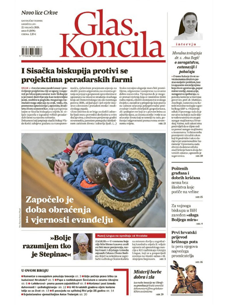 Novi broj Glasa Koncila na naslovnici podsjeća na početak korizme, vrijeme obraćenja i vjernosti evanđelju, a prenosi se i priopćenje Sisačke biskupije koja se usprotivila projektima peradarskih farmi na svojem području.
