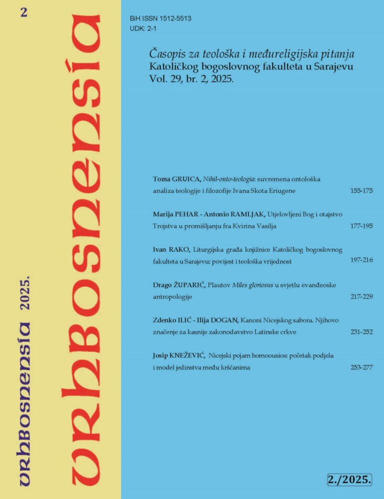 Autor zanimljivog interdisciplinarnog članka „Plautov Miles gloriosus u svjetlu evanđeoske antropologije“ je Drago Župarić koji poziva na teološko čitanje antičke komedije gdje se kroz lik hvalisavog vojnika razotkriva ljudska taština i otvara prostor za evanđeosku istinu o poniznosti. Konačno, Ivan Rako u članku „Liturgijska građa knjižnice Katoličkog bogoslovnog fakulteta u Sarajevu“ donosi vrijednu analizu liturgijskog fonda knjižnice Fakulteta potvrđujući je kao čuvaricu crkvene baštine.