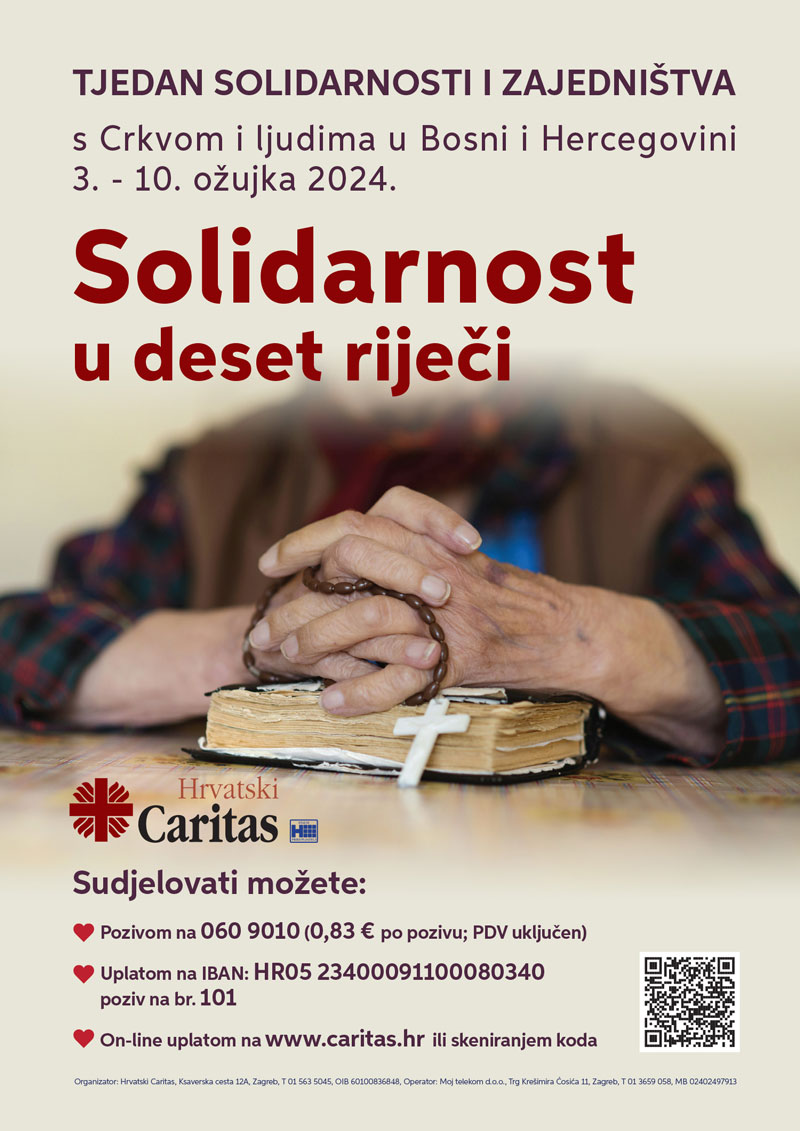 Ovogodišnji Tjedan solidarnosti i zajedništva, s motom „Solidarnost u deset riječi“, traje od 3. do 10. ožujka 2024. godine. Središnje euharistijsko slavlje bit će na Treću nedjelju korizme, 3. ožujka 2024. s početkom u 10,00 sati, u Biskupiji Banja Luka u župi Prijedor uz sudjelovanje predsjednika, nacionalnih i nad/biskupijskih ravnatelja i djelatnika Caritasa iz Republike Hrvatske i Bosne i Hercegovine. Euharistijsko slavlje uz sudjelovanje vjernika ove i drugih župnih zajednica medijski će pokriti Hrvatska radiotelevizija i Radiotelevizija Herceg Bosne uz sudjelovanje drugih radijskih postaja u obje zemlje.