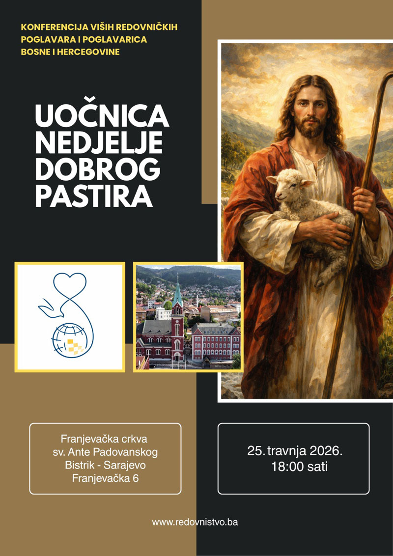 U povodu 63. svjetskog dana molitve za duhovna zvanja na uočnicu Nedjelje Dobrog Pastira, u subotu 25. travnja 2026. godine u Franjevačkoj crkvi sv. Ante Padovanskog na Bistriku u Sarajevu slavit će se sveta misa s početkom u 18 sati tijekom koje će biti pjevana molitva Večernje. Nakon mise slijedi euharistijsko klanjanje.