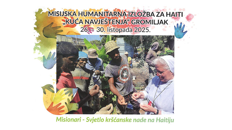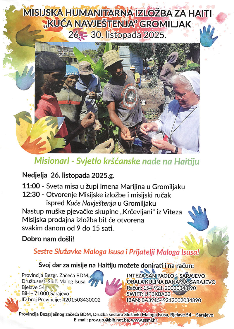 Sestre Služavke Maloga Isusa i Prijatelji Maloga Isusa pozivaju vjernike i sve ljude dobre volje na misijsku humanitarnu izložbu za Haiti pod geslom "Misionari – svjetlo kršćanske nade na Haitiju", koja će se održati od 26. do 30. listopada 2025. godine u "Kući Navještenja" u Gromiljaku.