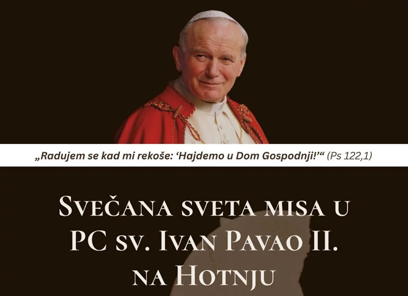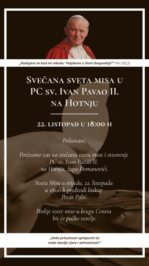 Svečano otvorenje Pastoralnog centra "Sveti Ivan Pavao II." u Hotnju koji pripada župi Domanovići, bit će u srijedu, 22. listopada, s početkom u 18 sati. Misno slavlje povodom otvorenja predvodit će biskup mons. Petar Palić, biskup mostarsko-duvanjski i apostolski upravitelj trebinjsko-mrkanski. Nakon euharistijskog slavlja uslijedit će pučko veselje u krugu Centra.