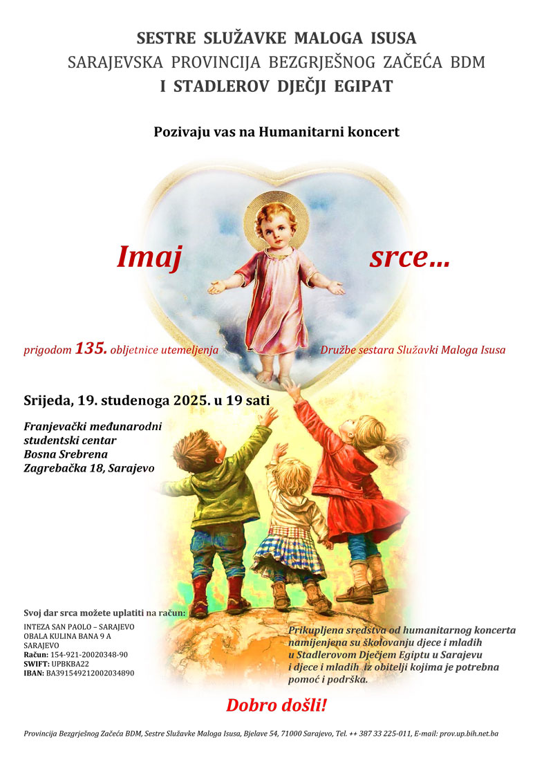 Sestre Služavke Maloga Isusa Sarajevske provincije i Stadlerov Dječji Egipat u Sarajevu organiziraju tradicionalni humanitarni koncert pod geslom sl. Božjega Josipa Stadlera „Imaj srce…“.