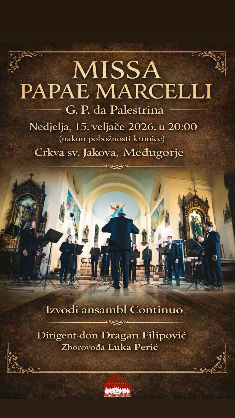 Djelo „Missa Papae Marcelli“ oživjet će kao živa liturgija ljepote, jednostavna, sveta i neobjašnjivo ljudska. Mladi glazbenici iz Udruge „Kulturni preporod“ pozivaju Vas da ih svojim dolaskom podržite u kulturnome radu te na zajedničko uživanje u glazbenome stvaralaštvu.