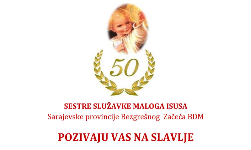 Sestre Služavke Maloga Isusa Sarajevske provincije Bezgrešnog Začeća Blažene Djevice Marije pozivaju vjernike na svečano slavlje zahvale Bogu za 50 godina redovničkih zavjeta s. M. Krunoslave Adžamić i s. M. Vladislave Blažević, koje će se održati u subotu, 24. siječnja 2026. godine, u Slavonskom Brodu.