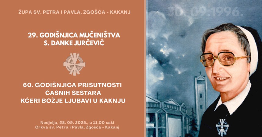 U nedjelju 28. listopada 2025. u crkvi sv. Petra i Pavla (Zgošća – Kakanj) misnim slavljem u 11 sati bit će obilježena 29. obljetnica mučeničke smrti s. Danke Jurčević iz Družbe sestara Kćeri Božje ljubavi te 60. godišnjica prisutnosti sestara KBLJ u Kaknju.