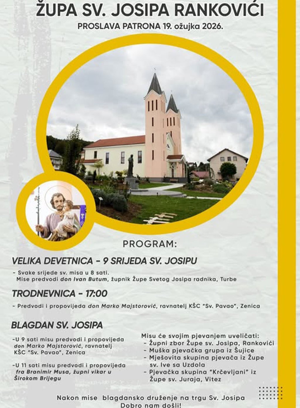 Vjernička zajednica u Rankovićima kod Novog Travnika svečano će 19. ožujka proslaviti svog nebeskog zaštitnika, izvijestila je Nedjelja.