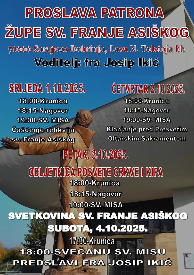 Franjevačka župa sv. Franje Asiškog u sarajevskoj četvrti Dobrinja proslavlja svoj patron u subotu 4. listopada, izvijestila je Nedjelja, portal Katoličkog tjednika.