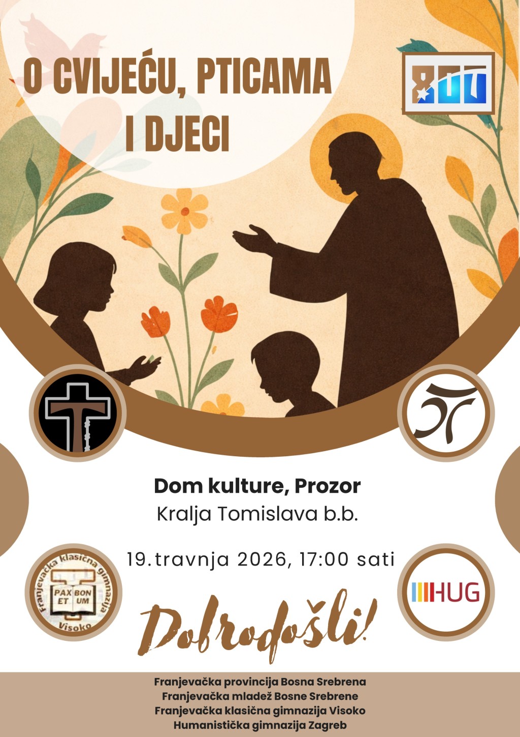 U Domu kulture u Prozoru (Kralja Tomislava b.b.), 19. travnja 2026. s početkom u 17:00 sati učenici Franjevačke klasične gimnazije Visoko i učenici Humanističke gimnazije Zagreb zajedno će izvesti predstavu „O cvijeću, pticama i djeci“.