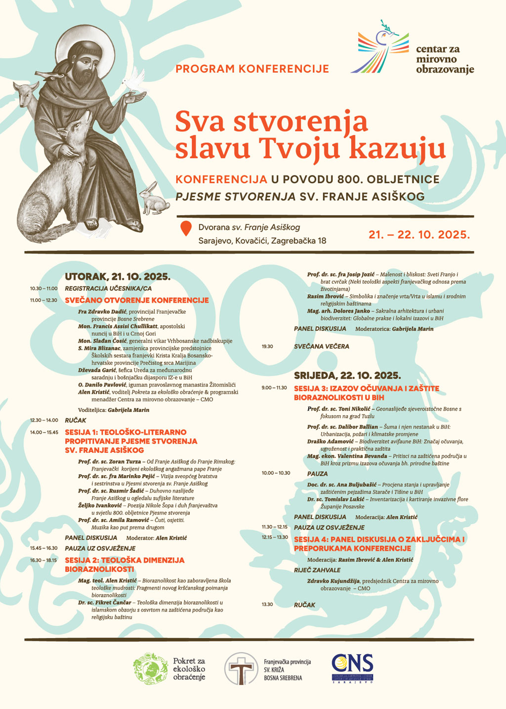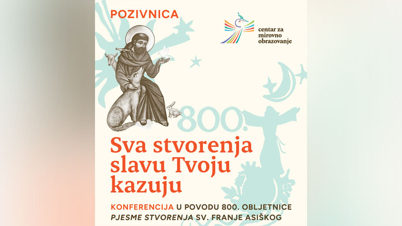U organizaciji Centra za mirovno obrazovanje (CMO), a u povodu 800. obljetnice „Pjesme stvorenja“ sv. Franje Asiškog, od 21. do 22. listopada 2025. u Sarajevu, u Dvorani sv. Franje Asiškog na Kovačićima, bit će upriličena dvodnevna regionalna konferencija „Sva stvorenja slavu Tvoju kazuju“, izvijestili su iz CMO-a.