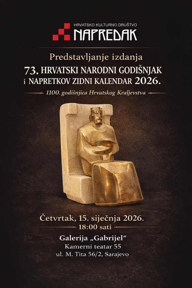 Hrvatsko kulturno društvo Napredak poziva na predstavljanje 73. Hrvatskog narodnog godišnjaka i Napretkovog zidnog kalendara za 2026. godinu, posvećenog 1100. godišnjici Hrvatskog Kraljevstva, koje će se održati u četvrtak 15. siječnja 2026. godine u 18 sati u Galeriji “Gabrijel”, Kamerni teatar 55, ul. M. Tita 56/2 u Sarajevu.