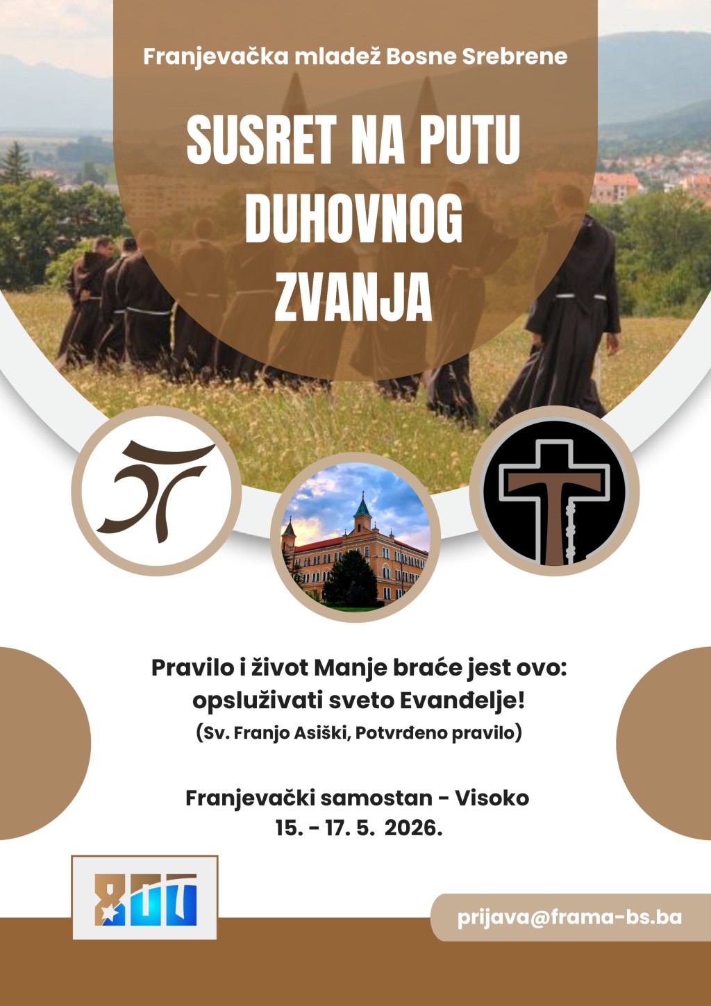 U organizaciji Frame Bosne Srebrene, u samostanu sv. Bonaventure u Visokom će se od 15. do 17. svibnja 2026. održati „Susret na putu duhovnog zvanja“ predviđen za mladiće srednjoškolce, studente ili starije koji razmišljaju o duhovnom zvanju, objavljeno je na mrežnoj stranici Bosne Srebrene.