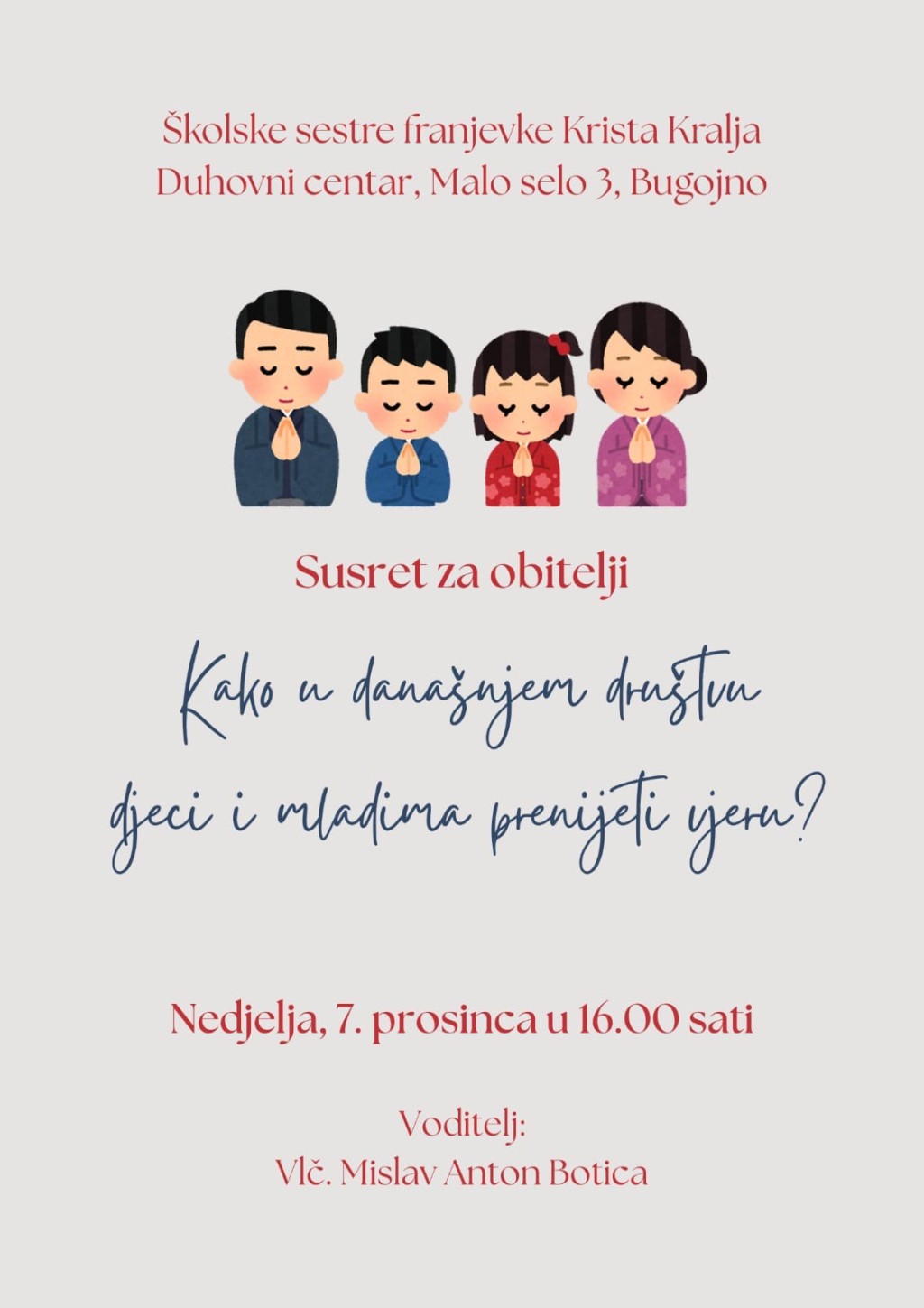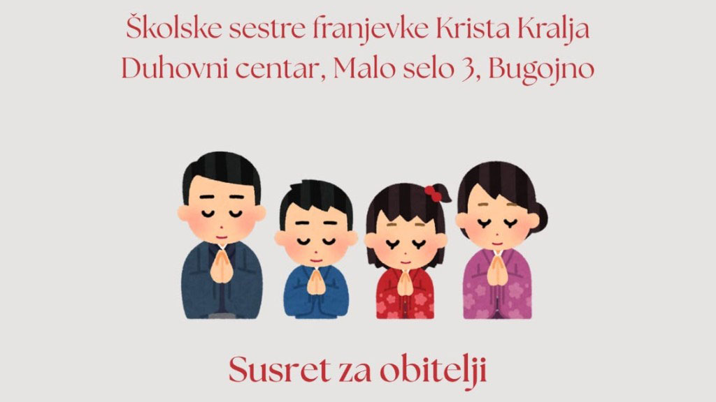 U duhovnom centru Školskih sestara franjevki u Bugojnu, u nedjelju 7. prosinca 2025. s početkom u 16 sati održat će se susret za obitelji.