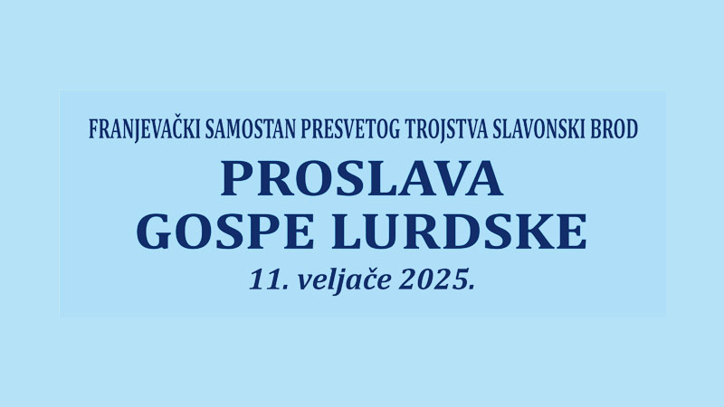 Svetkovina Gospe Lurdske proslavlja se u utorak, 11. veljače 2025. u franjevačkoj crkvi Presvetog Trojstva u Slavonskom Brodu. Misna slavlja su: u 7, 10 i u 17 sati.