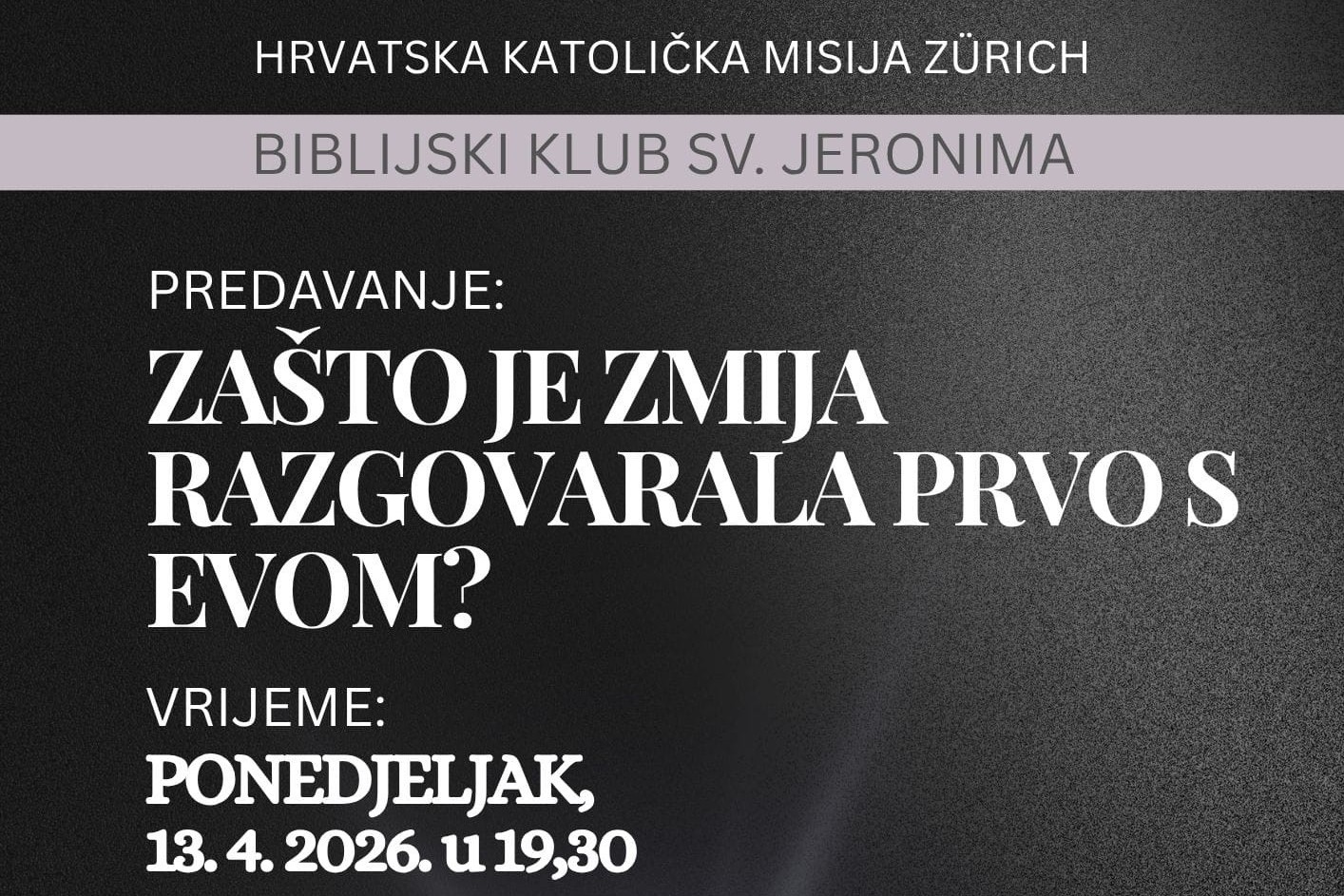Biblijski klub sv. Jeronima Hrvatske katoličke misije Zürich u sklopu biblijskih predavanja organizira tribinu u dvorani župe sv. Felixa i Regule (Hirzelstrasse 20, 8004 Zϋrich), u ponedjeljak 13. travanja 2025. u 19,30 sati. Tema predavanja je: „Zašto je zmija provo razgovarala s Evom?". Predavač će biti prof. dr. sc. fra Iko Skoko. (kta/i.s.)