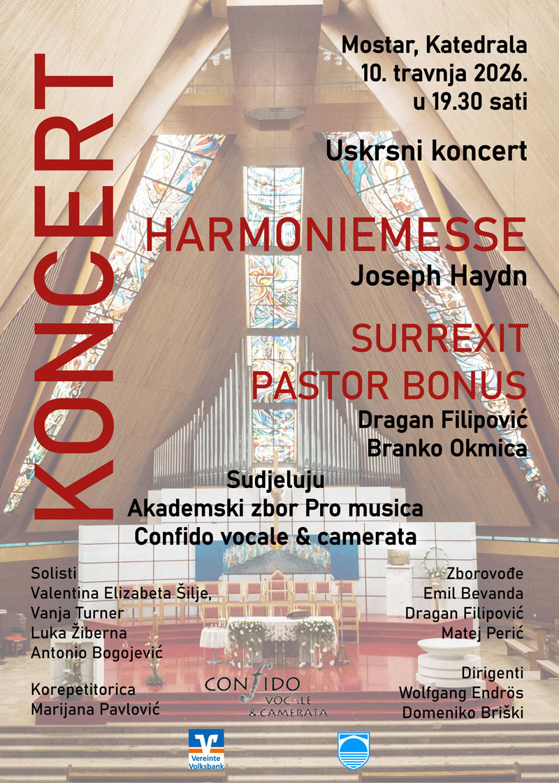 Koncert je organiziran u suradnji Confido vocale & camerata iz njemačkog Dorstena i Akademskog zbora Pro musica iz Mostara, a više od stotinu i pedeset izvođača ponudit će publici bogat uskrsni glazbeni doživljaj kroz klasično i suvremeno glazbeno djelo.