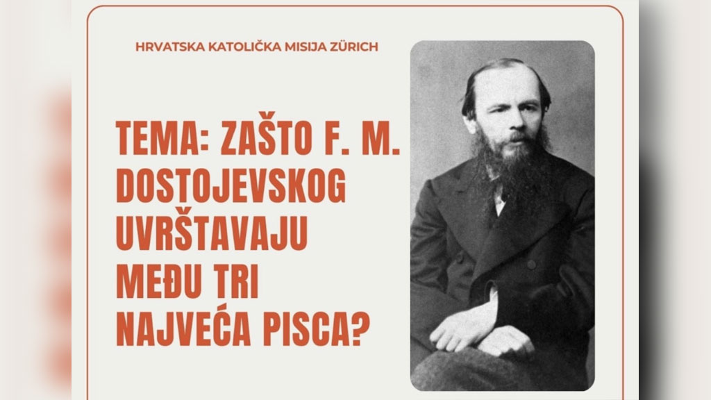Hrvatska katolička misija Zϋrich organizira tribinu na temu „Zašto Dostojevskog uvrštavaju među tri najveća pisca?" koja će se održati u Zϋrichu, u dvorani župe sv. Josipa (Röntgenstrasse 80) u ponedjeljak 9. veljače 2026. u 19,30. Predavač je prof. dr. sc. fra Iko Skoko. (kta)