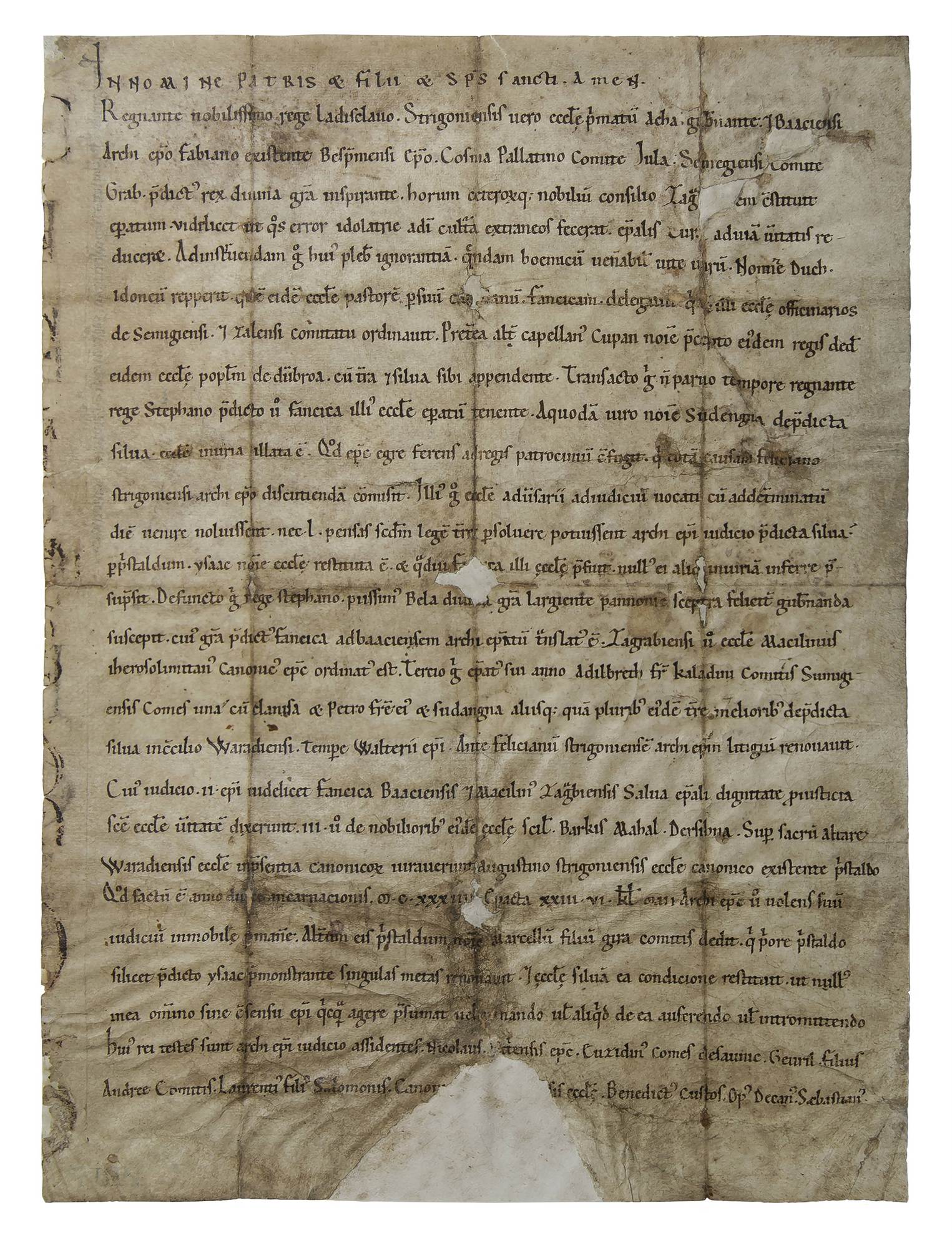 Osim Felicijanove povelje iz 1134. godine, Zagrebačka nad/biskupija posjeduje i "dokument " od samog svog osnivača, a to je Ladislavov plašt-kazula iz 11. stoljeća (T 1). Budući da je papa Celestin III. 1192. godine kanonizirao svetog Ladislava, plašt-kazula je njegova relikvija. Kralj Ladislav rođen je oko 1045. godine u Poljskoj od majke poljske kneginje Richese, kćeri poljskog kneza Mješka (Mieszka). Ladislavov plašt-kazula izrađen je iz skupocjene svile, indigo boje. Svila je tkana ručno u 11. stoljeću sa zlatnim nitima i srmom u motivima šesterokuta. U 14. stoljeću Ladislavov plašt prekrojen je u zvonoliku misnicu. Tada su zlatnim i raznobojnim svilenim nitima izvezeni likovi sv. Ladislava i njegove sestre Jelene, supruge hrvatskog kralja Zvonimira s hrvatskom krunom na glavi. Ladislavov plašt-kazula obnovljen je 1988. godine u glasovitom švicarskom Konzervatorskom zavodu Riggisbergu kod Berna, a obnavljala ga je glasovita konzeravatorica Mechtild Flury Lamberg koja je nedavno istražila i obnovila Torinsko platno.