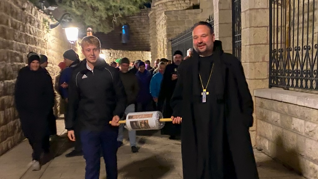 Njemački benediktinci u pratnji vjernika, nakon polnoćke i noćnog molitvenog bdijenja (vigilije), u božićnoj noći i ove će se godine, kao nekoć pastiri, uputiti pješice u Betlehem gdje će na mjestu Isusova rođenja položiti listu s imenima i pomoliti se za sve njih. Nakon toga molit će jutarnju molitvu (Laudes) na mjestu Isusova rođenja. Iz Jeruzalema će krenuti u 2 sata, a u 10-ak kilometara udaljeni Betlehem stići će oko 4.30 sata ujutro.