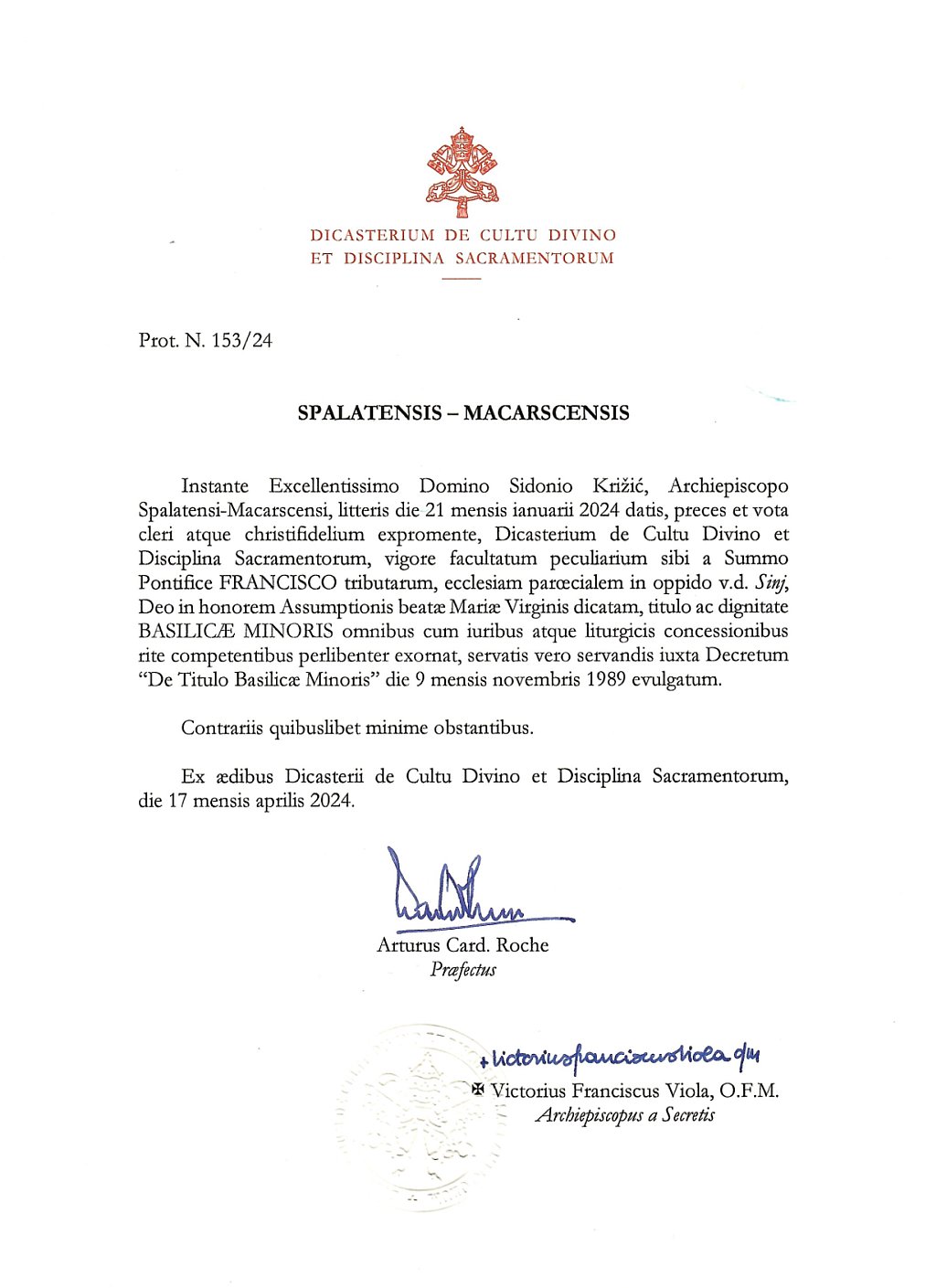 Dekret o uzdizanju crkve Uznesenja Blažene Djevice Marije (Svetište Gospe Sinjske) u Sinju na čast manje bazilike, koji je 17. travnja 2024. godine objavio Dikasterij za bogoštovlje i disciplinu sakramenata.