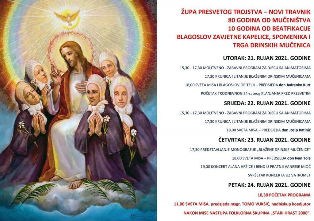 Prigodom obilježavanja 80. obljetnice mučeništva i 10. proglašenja blaženim Drinskih mučenica župa Presvetoga Trojstva u Novom Travniku organizira niz događaja od 21. do 24. rujna 2021.