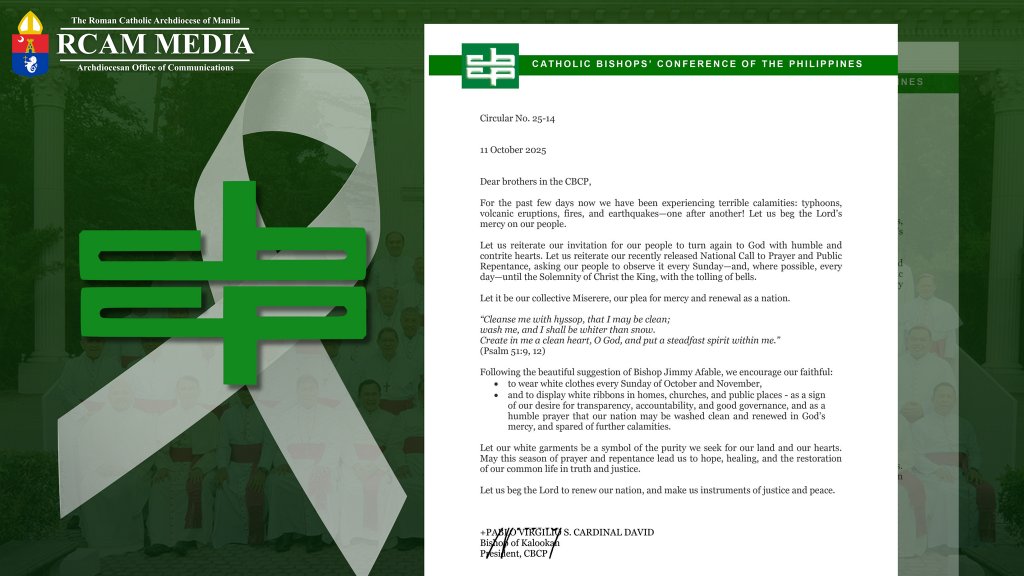 Suočeni s gorućim korupcijskim skandalima i nizom razornih prirodnih katastrofa, katolički biskupi Filipina pozvali su vjernike na čin pokore i javnu molitvu. Do svetkovine Krista Kralja 23. studenog katolici su pozvani nositi bijelu odjeću svake nedjelje i pričvrstiti bijele vrpce na kuće, crkve i javna mjesta kao znak nacionalne obnove i dobrog upravljanja.