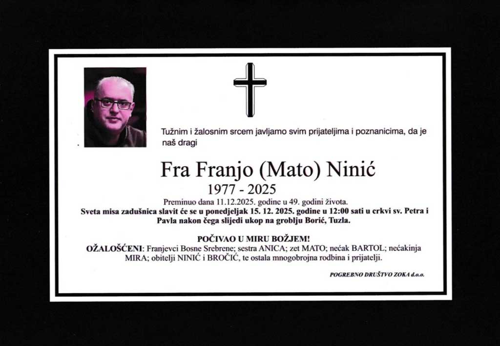 Na mrežnoj stranici Franjevačke provincije Bosne Srebrene objavljene su informacije o sprovodu njihova člana i svećenika fra Franje Ninića koji je preminuo 11. prosinca 2025. u 49. godini života.