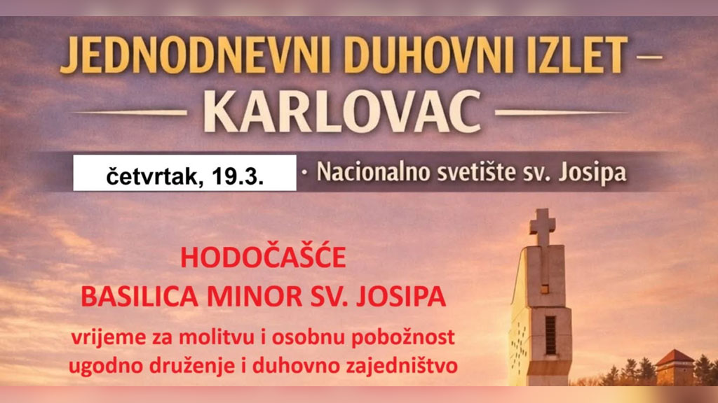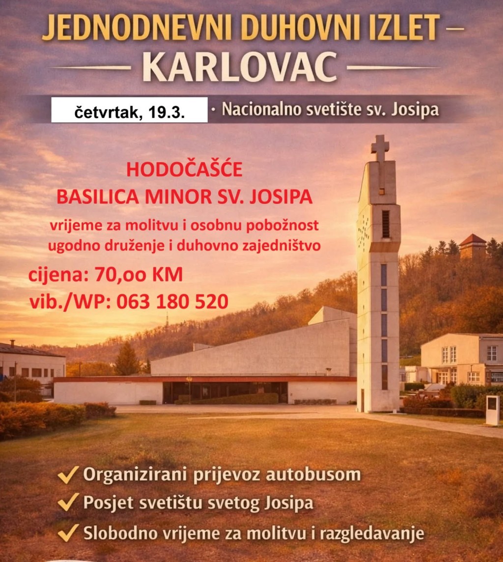 Turistička agencija „Kenova“ iz Viteza organizira u četvrtak 19. ožujka 2026. jednodnevni duhovni izlet u Hrvatsko nacionalno svetište sv. Josipa – Karlovac. Polasci su iz Sarajeva, Kiseljaka, Busovače, Viteza i Travnika.