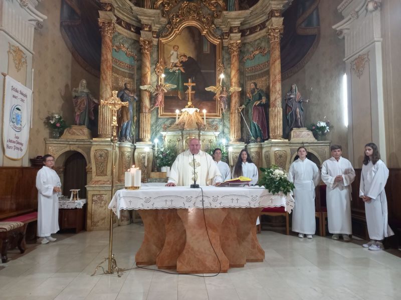 Nakon predstave uslijedilo je i samo središnje slavlje, sveta misa, koju je predvodio župnik Nikolić. U svojoj propovijedi vlč. Nikolić osvrnuo se na povijest nastanka Provincije čije ime, a to je Božja providnost, uočava i u putu koje su sestre prošle spominjući se života bl. Jule Ivanišević. Put je to, kako kaže župnik, pun radosti i boli, veselja, padova, čak i grijeha, ali i ustajanja, to je put u kojem se odvija život, a u taj život, po našoj molitvi, ulazi sam Bog. Providnost Božja zna što radi, a mi uživamo plodove te providnosti upravo po ponosu koji osjećamo što je Družba iznjedrila sestru Julu, koja je živjela svetim životom i u čiji se zagovor mi danas utječemo. Kao razlog okupljanja, vlč. Ivan ističe upravo Božju providnost koja je htjela da se njihovo mjesto, Staro Petrovo Selo, obogati prizorom i molitvom tolikih sestara koje, kao i sav puk, imaju za uzor upravo primjer života naše Blaženice, sestre Jule, kao i ostalih Drinskih mučenica. Na kraju svete mise, Župnik je, uz zahvalu sestrama što su došle na slavlje u Staro Petrovo Selo, s. Gordani Igrec, provincijalnoj glavarici, uručio cvijeće, a za uzvrat je s. Gordana župniku predala misnicu crvene boje koju su izradile sestre u radionici misnog ruha u Zagrebu.