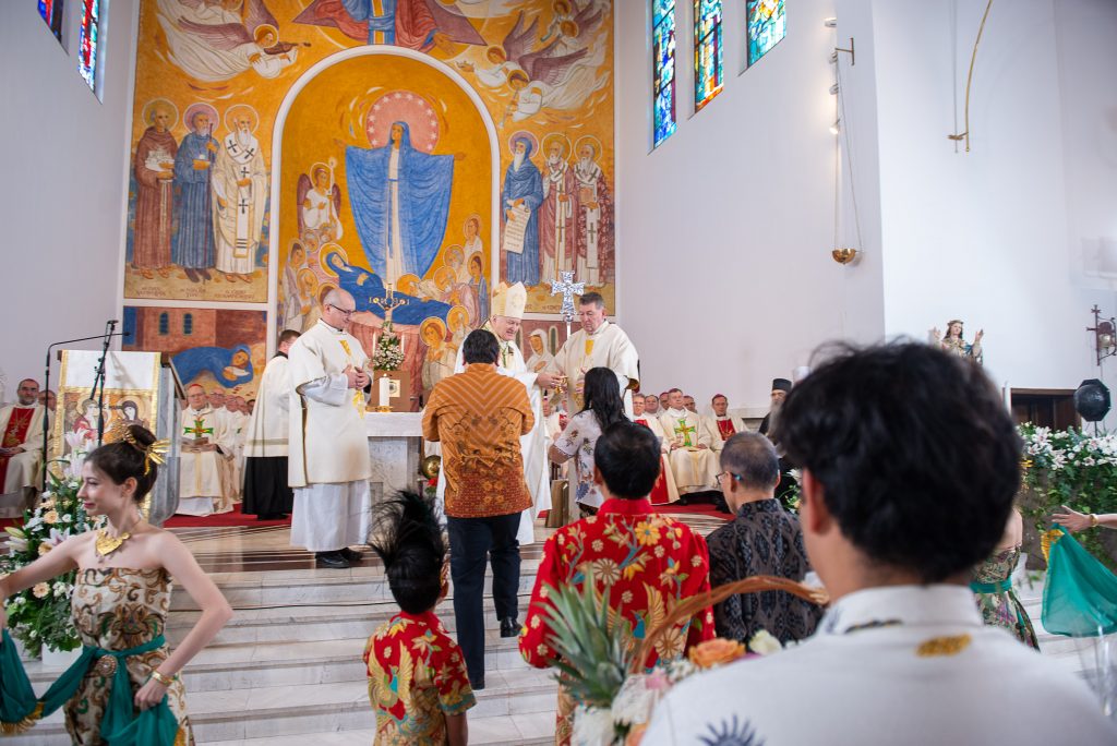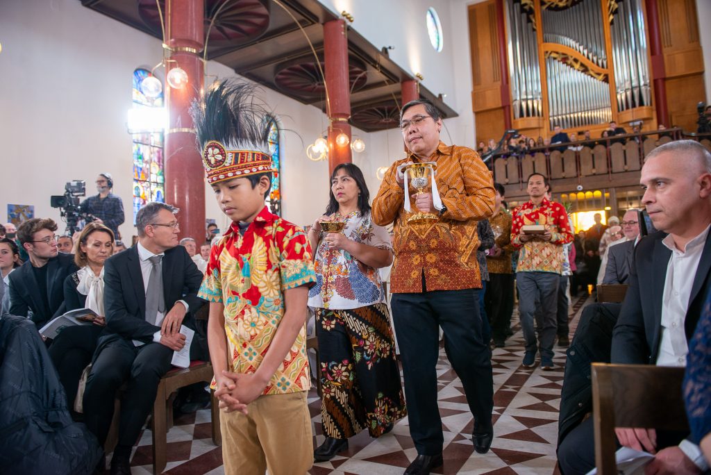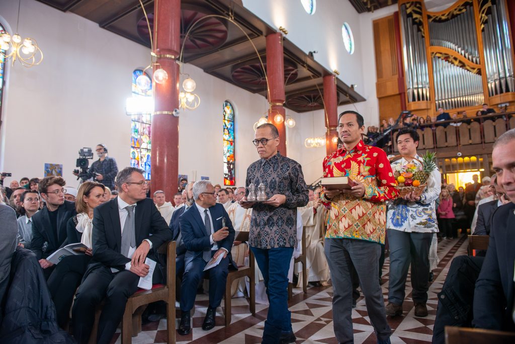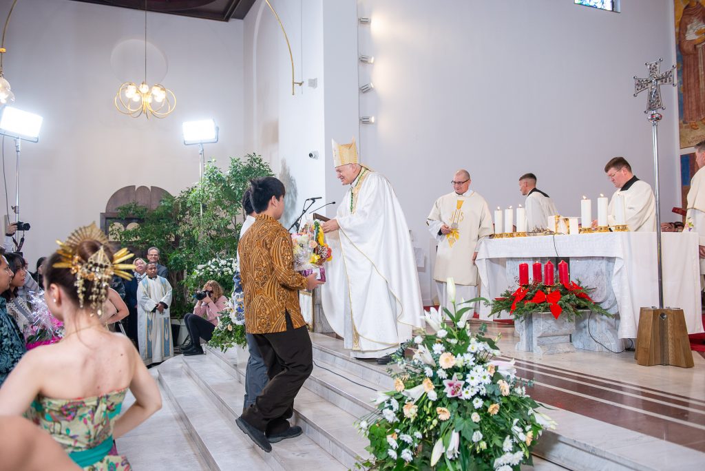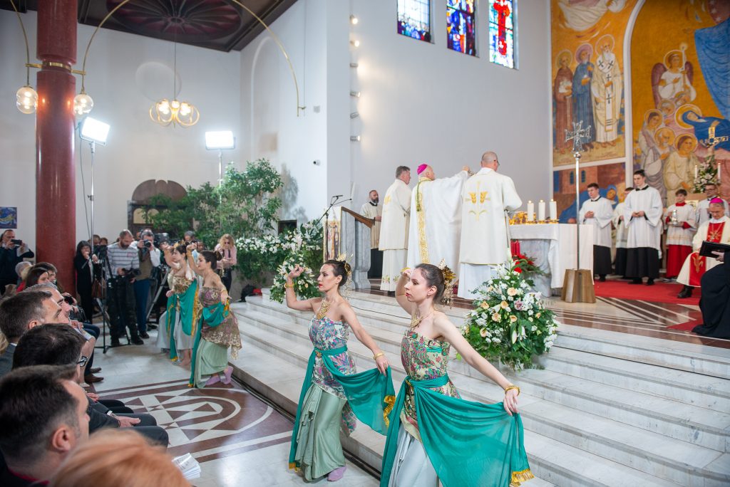 Nakon ispovijedanja vjere prisutnih vjernika te upućene molitve vjernika na više jezika, za prinos darova pobrinuli su se vjernici iz Indonezije uz njihov tradicionalni ples i pjesmu. Povod tome je prijašnje višegodišnje pastoralno djelovanje nadbiskupa Nemeta na Filipinima.