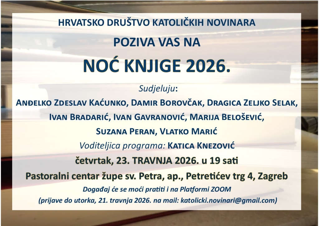 U organizaciji Hrvatskog društva katoličkih novinara, u četvrtak 23. travnja 2026. s početkom u 19 sati u Pastoralnom centru župe sv. Petra, ap. (Petretićev trg 4) u Zagrebu bit će upriličena „Noć knjige 2026.“, izvijestili su iz HDKN-a.