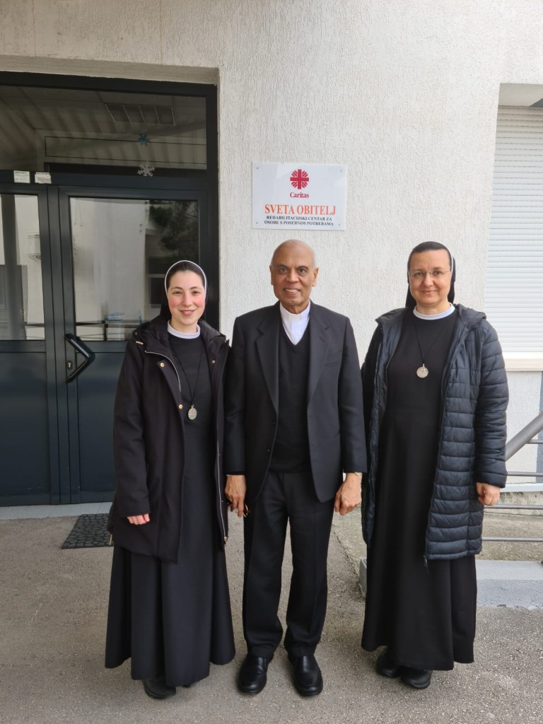 S. Suzana, koja je prije dolaska u Mostar stekla bogato iskustvo rada sa starijim osobama u jednom Caritasovu domu u Njemačkoj, upoznala je apostolskog nuncija s radom u Rehabilitacijskom centru „Sveta Obitelj“. Istaknula je da su sestre Služavke Malog Isusa, u skladu s Konstitucijama Družbe, pozvane, po Isusovu primjeru, služiti najmanjoj braći i sestrama: nejakoj siročadi, zapuštenoj djeci, zaboravljenim starcima, bolesnicima i siromasima. U tom duhu i ona, kao i sestre koje su tu djelovale prije nje, nastoji služiti potrebnima i u ovom Centru posvećenom Svetoj Obitelji. U ugodnom razgovoru bilo je riječi o ljepoti služenja, molitvi, zajedništvu i svemu onome što oblikuje svakodnevni život jedne Bogu posvećene osobe i redovničke zajednice.
