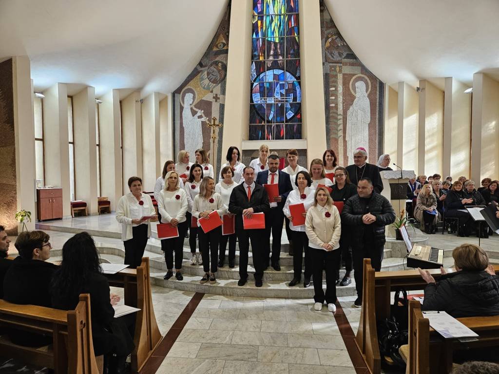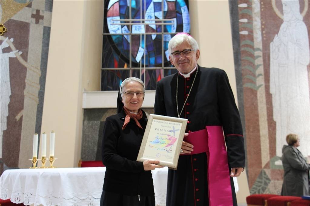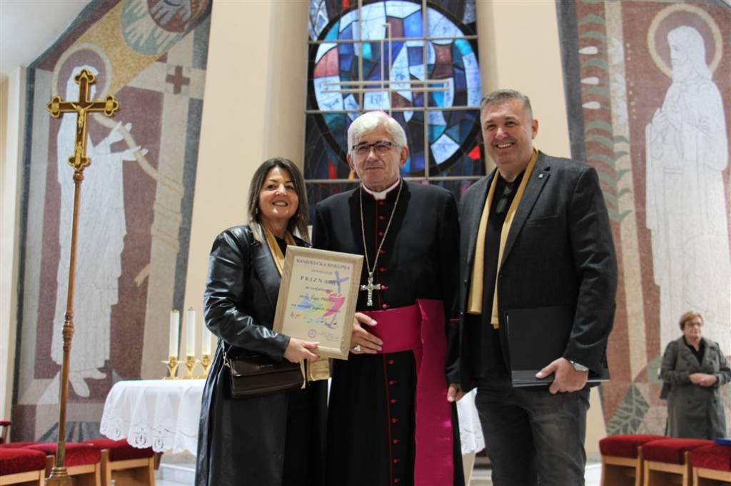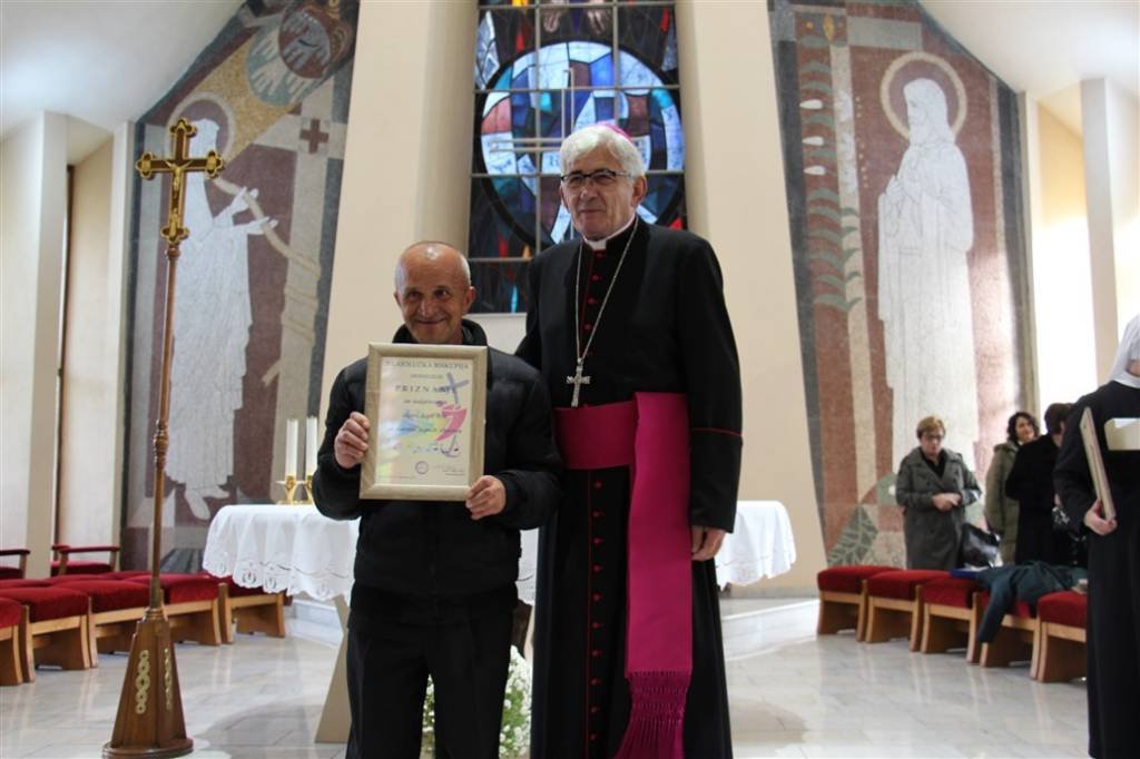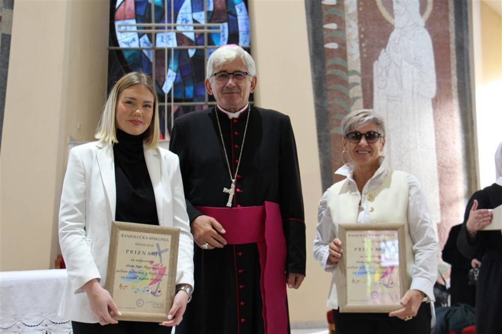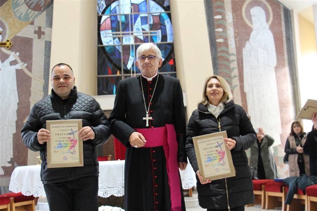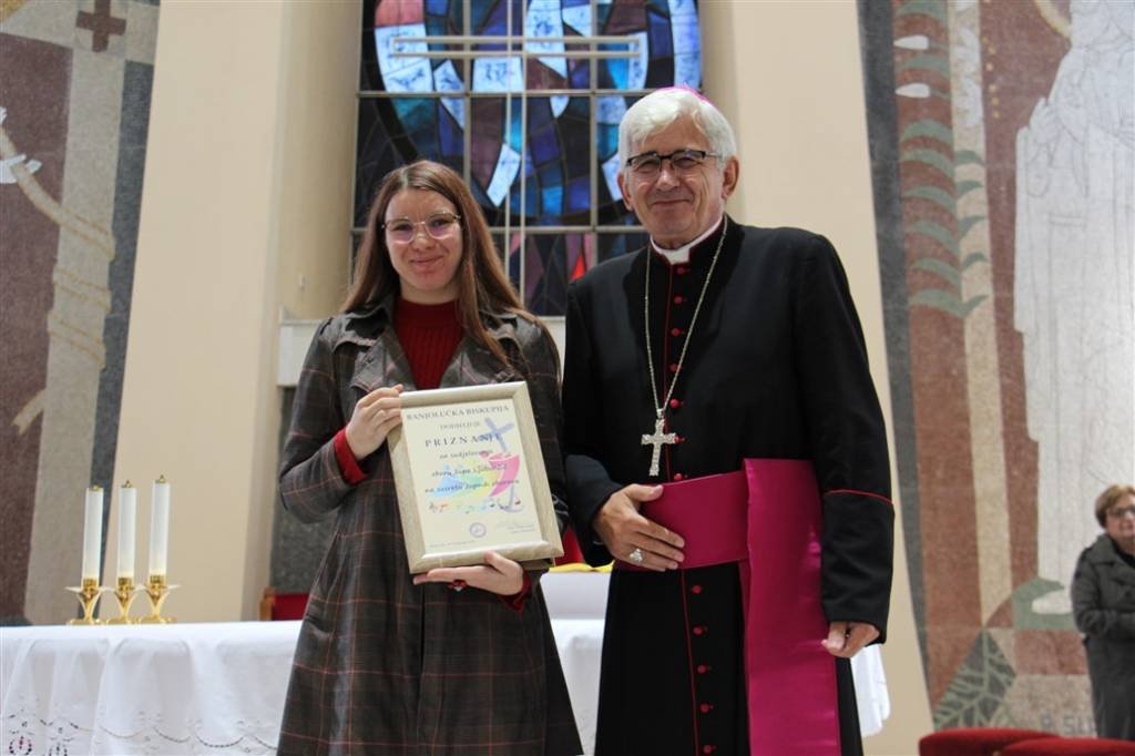 Na kraju je biskup Željko svim zborovima podijelio priznanja te zahvalio Povjerenstvu za crkvenu glazbu, kao i voditeljima zborova i pjevačima za trud koji ulažu u njegovanju liturgijskog pjevanja. Također, posebno priznanje za dugogodišnje njegovanje crkvenog pjevanja primile su „počimalje“ Milka Begić iz župe Ravska i Ružica Remić iz župe Ljubija.