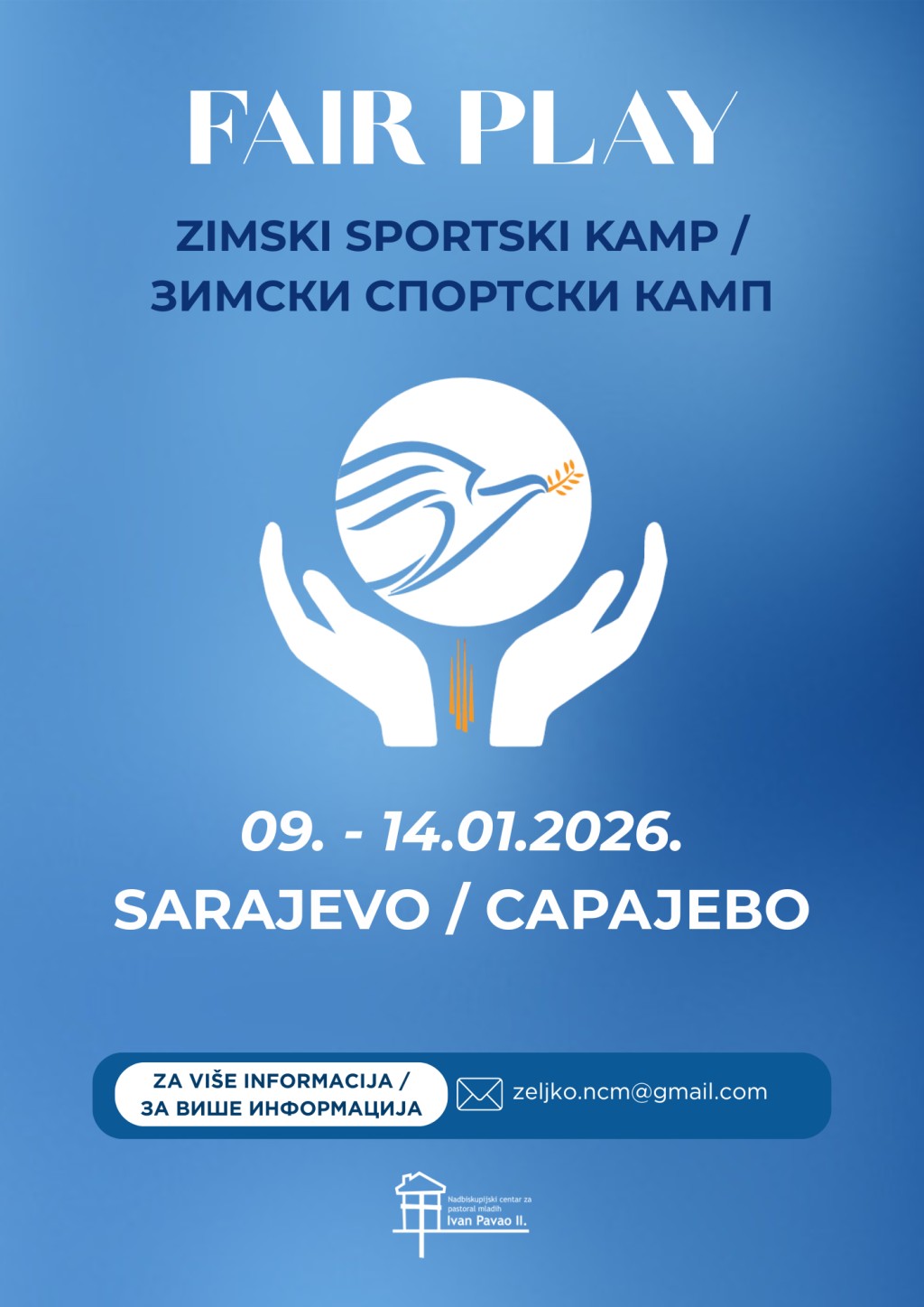 Nadbiskupijski centar za pastoral mladih „Ivan Pavao II.“ u Sarajevu poziva sve mlade u dobi od 15 do 20 godina da se prijave na međureligijski zimski sportski kamp „Fair Play“ koji će se održati od 9. do 14. siječnja 2025. u prostorijama Centra (Gatačka 18 – Otoka, Sarajevo), izvijestili su iz NCM-a.