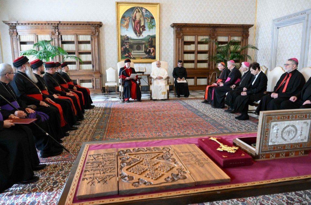 Primio ga je zajedno s članovima Zajedničkoga povjerenstva za Teološki dijalog između Katoličke Crkve i Asirske Crkve Istoka koji se ponovno nalaze u Vatikanu nakon prošlogodišnjeg posjeta kojim se obilježila trideseta obljetnica potpisivanja zajedničke izjave koja je označila temeljni korak na putu prema punom zajedništvu između katoličke i te istočne zajednice. Ne zaboravljajući položaj kršćana na Bliskom istoku i osvrćući se na 1700 godina od Nicejskog sabora, Sveti Otac je izrazio nadu da će se razviti model punog zajedništva koji ne podrazumijeva dominaciju, nego promiče razmjenu darova Duha Svetoga.