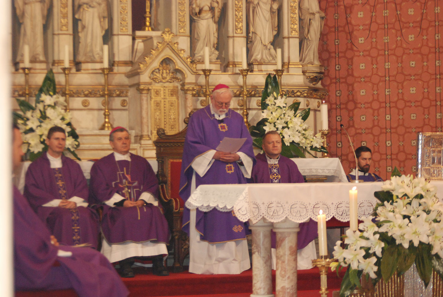 Raduje me i čast mi je što Vas, u ime u ime cijele zajednice katoličkih vjernika i njezinih biskupa u Bosni i Hercegovini, te posebice u ime svih vjernika, svećenika, redovnika i redovnica, bogoslova i sjemeništaraca Vrhbosanske nadbiskupije, mogu pozdraviti u ovoj katedrali Srca Isusova neposredno prije početka Euharistijskoga slavlja i molitve za mir.