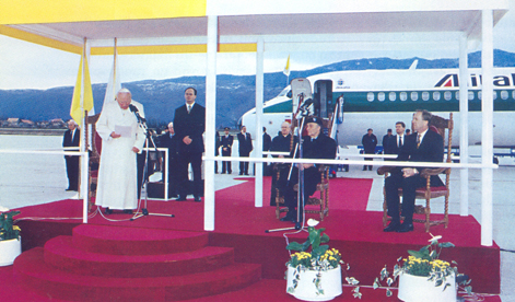 Sarajevska je zračna luka, u kojoj se upravo nalazimo, često puta tijekom nedavnoga rata bila jedina vrata za humanitarnu pomoć ovome gradu. Sada i ja, kao "hodočasnik mira i prijateljstva", prolazim kroz ova vrata nošen željom da svim svojim silama služim miru u pravdi i stvari pomirenja. Trenutak je da toj plemenitoj stvari svi ljudi dobre volje posvete svoje najbolje sile. Mir će pobijediti ako svi budu znali raditi u isitni i pravdi, idući istodobno ususret zakonitim očekivanjima stanovnika ovih krajeva koji u svojoj složenoj raznolikosti mogu postati znakom za čitavu Europu.