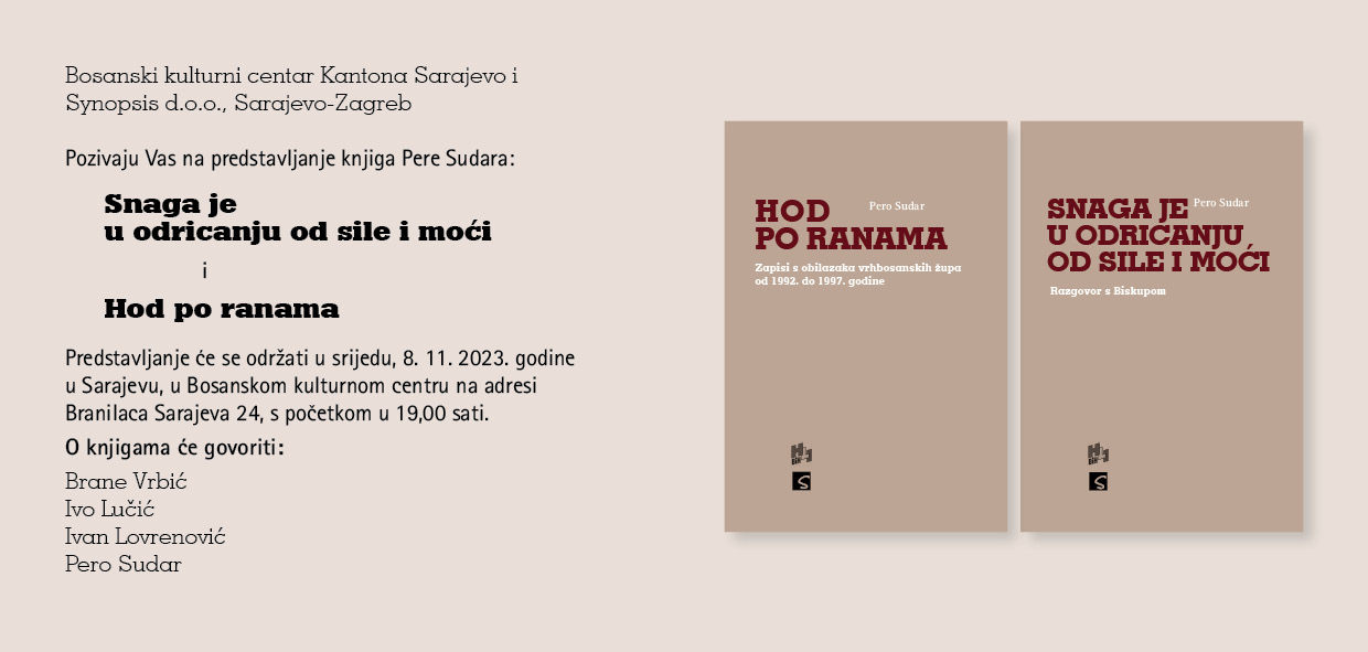 U srijedu, 8. studenoga 2023. u Bosanskom kulturnom centru (Branilaca Sarajeva 24) u Sarajevu s početkom u 19 sati, u organizaciji BKC-a Kantona Sarajevo i Synopsis d.o.o., Sarajevo-Zagreb, bit će upriličeno predstavljanje knjiga mons. Pere Sudara, pomoćnog biskupa vrhbosanskog u miru: „Snaga je u odricanju od sile i moći“ i „Hod po ranama“.