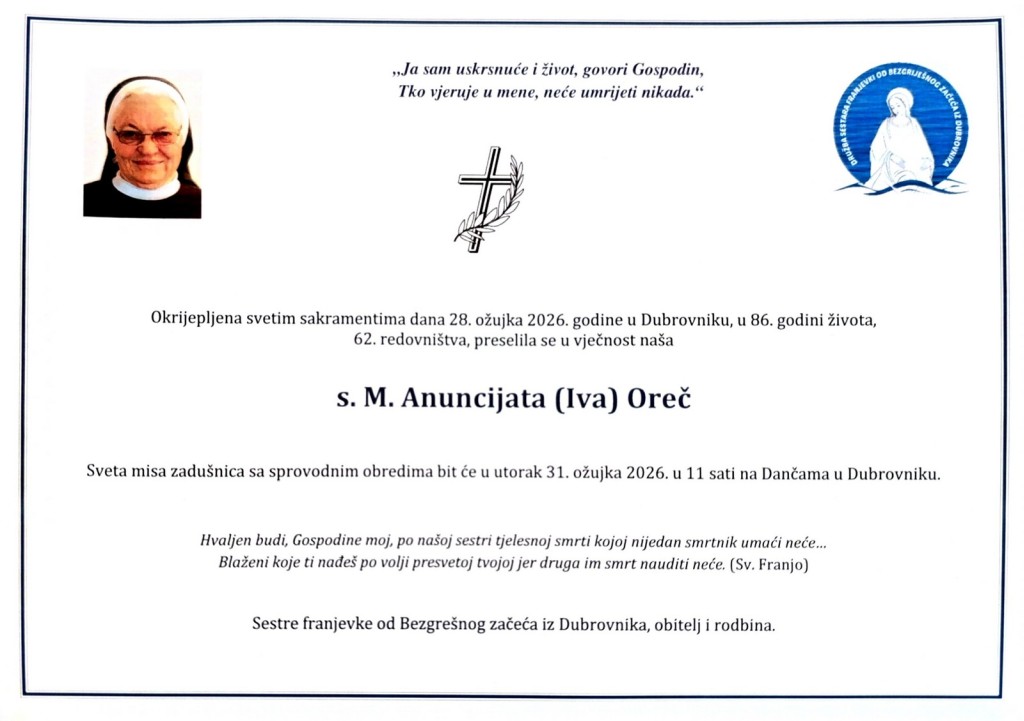 Redovnica družbe Sestara franjevki od Bezgrešnog začeća iz Dubrovnika, s. Anuncijata Oreč preminula je u subotu 28. ožujka u samostanu sv. Marije na Dančama u Dubrovniku u 86. godini života i 62. godini redovništva, izvijestili su iz Družbe, prenosi IKA.