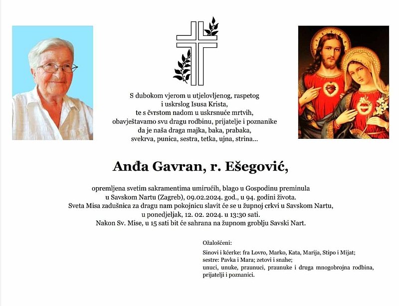 U Savskom Nartu (Zagreb), 9. veljače 2024. u 94. godini života blago je u Gospodinu preminula Anđa Gavran, r. Ešegović, majka fra Lovre Gavrana, člana Franjevačke provincije Bosne Srebrene, objavljeno je na mrežnoj stranici spomenute Provincije.
