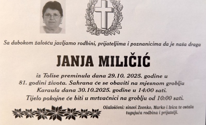 U srijedu 29. listopada 2025. u 81. godini života blago je u Gospodinu preminula Janja Miličić, majka fra Zvonke Miličića, člana Franjevačke provincije Bosne Srebrene.