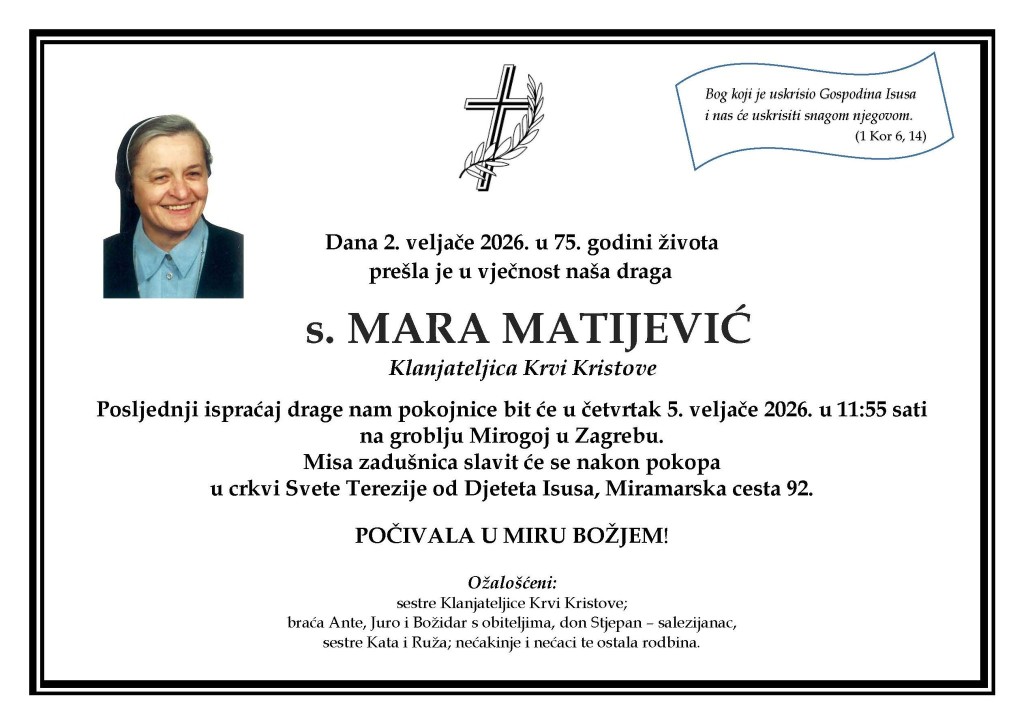 U ponedjeljak 2. veljače 2026., u 75. godini života preminula je s. Mara Matijević, članica Klanjateljica Krvi Kristove Regije Zagreb.