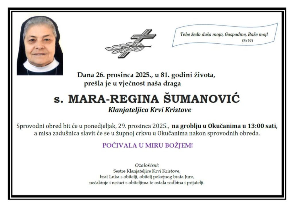 U petak 26. prosinca 2025., u 81. godini života preminula je s. Mara-Regina Šumanović, članica Klanjateljica Krvi Kristove, objavljeno je na mrežnoj stranici Regije Zagreb.