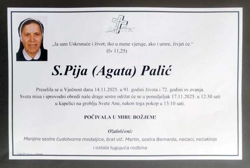 Redovnica Družbe Marijinih sestara čudotvorne medaljice s. Pija (Agata) Palić preminula je u samostanu u Osijeku petak 14. studenoga 2025. u 91. godini života i 72. godini redovničkih zavjeta, izvijestio je Tiskovni ured Đakovačko-osječke nadbiskupije, prenijela je IKA.