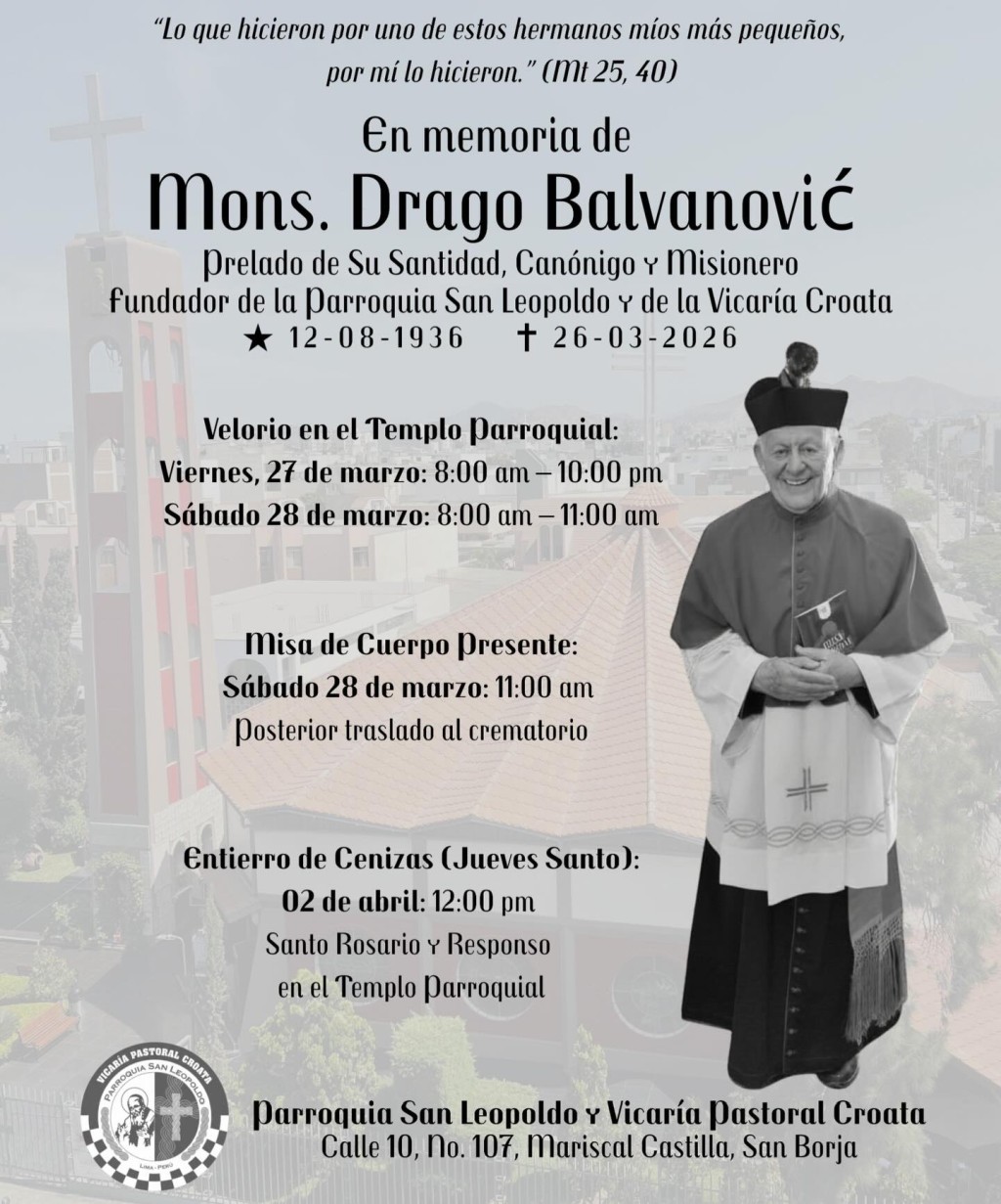 U Limi je 26. ožujka 2026. preminuo mons. Drago Balvanović, svećenik Banjolučke biskupije, dugogodišnji delegat hrvatske inozemne pastve za Južnu Ameriku, umirovljeni župnik župe sv. Leopolda Mandića u Limi i voditelj Hrvatske katoličke misije (Hrvatskog pastoralnog vikarijata) Lima, objavljeno je na facebook stranici Ravnateljstva dušobrižništva za Hrvate u inozemstvu.