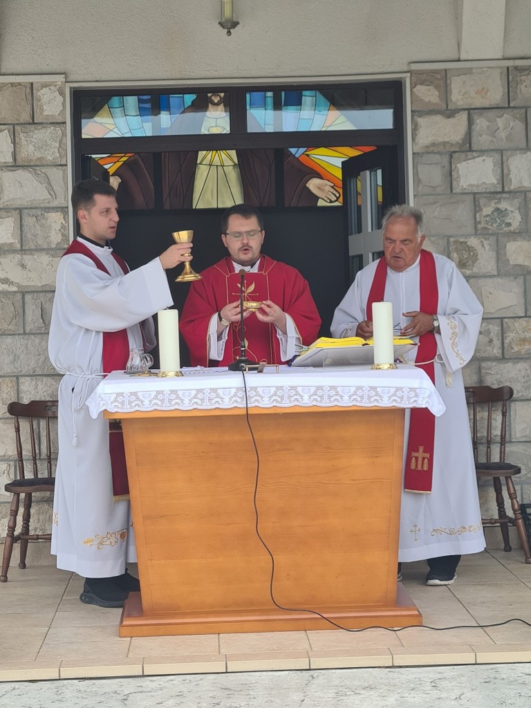 Svetu misu ispred kapelice predvodio je don Bojan Ivešić, generalni tajnik Biskupske konferencije BiH u koncelebraciji s umirovljenim svećenikom don Antom Kutlešom i domaćim župnikom don Ivanom Aničićem.