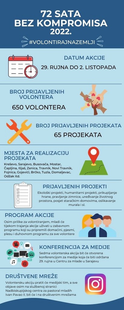 U četvrtak, 29. rujna 2022. konferencijom za medije započinje volonterska akcija „72 sata bez kompromisa“, koja se u Bosni i Hercegovini realizira od 2010. godine kada je na akciji sudjelovalo 800 volontera, priopćeno je na mrežnoj stranici Nadbiskupijskog centra za pastoral mladih „Ivan Pavao II.“