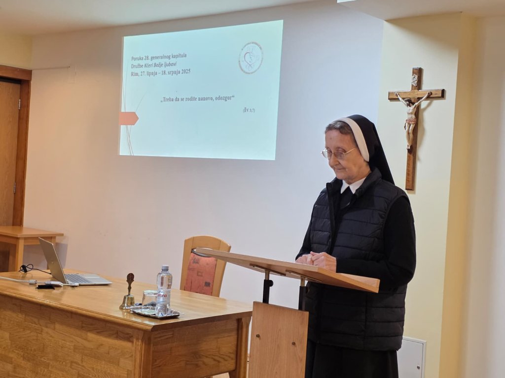 Završno predavanje na temu „Služba predstojnice – Vodstvo u ljubavi“ (usp. Lk 22,27c) održala je s. Nevenka Jurak, provincijalna glavarica. Promišljanje je temeljila na poglavlju Konstitucija Služenje autoriteta koje, između ostaloga, govori o obvezama i pravima predstojnica. Navedenom poglavlju prethodi citat iz Evanđelja po Luki: „Ja sam posred vas kao onaj koji poslužuje“ (Lk 22,27c). Provincijalna glavarica s. Nevenka navela je da se spomenuta Isusova rečenica može razumjeti kao „oporuka učenicima, kao neobičan ili provocirajući primjer jer ovom izjavom Isus definira hijerarhiju na novi način, sasvim suprotan zemaljskim hijerarhijama i pritom polazi od sebe“. U tom je kontekstu istaknula da svaka predstojnica, nasljedujući Kristov primjer, treba biti ona koja poslužuje, koja stavlja potrebe drugih ispred vlastitih, ona koja je spremna pomoći i podržati sestru do sebe. „U Družbi Kćeri Božje ljubavi, služba predstojnice je konkretno utjelovljenje karizme – ljubiti i služiti. Njezina snaga dolazi iz molitve, njezina mudrost iz slušanja, a njezina radost iz zajedništva. Biti predstojnica znači upravo to: ljubiti. A ljubiti znači služiti“, kazala je.