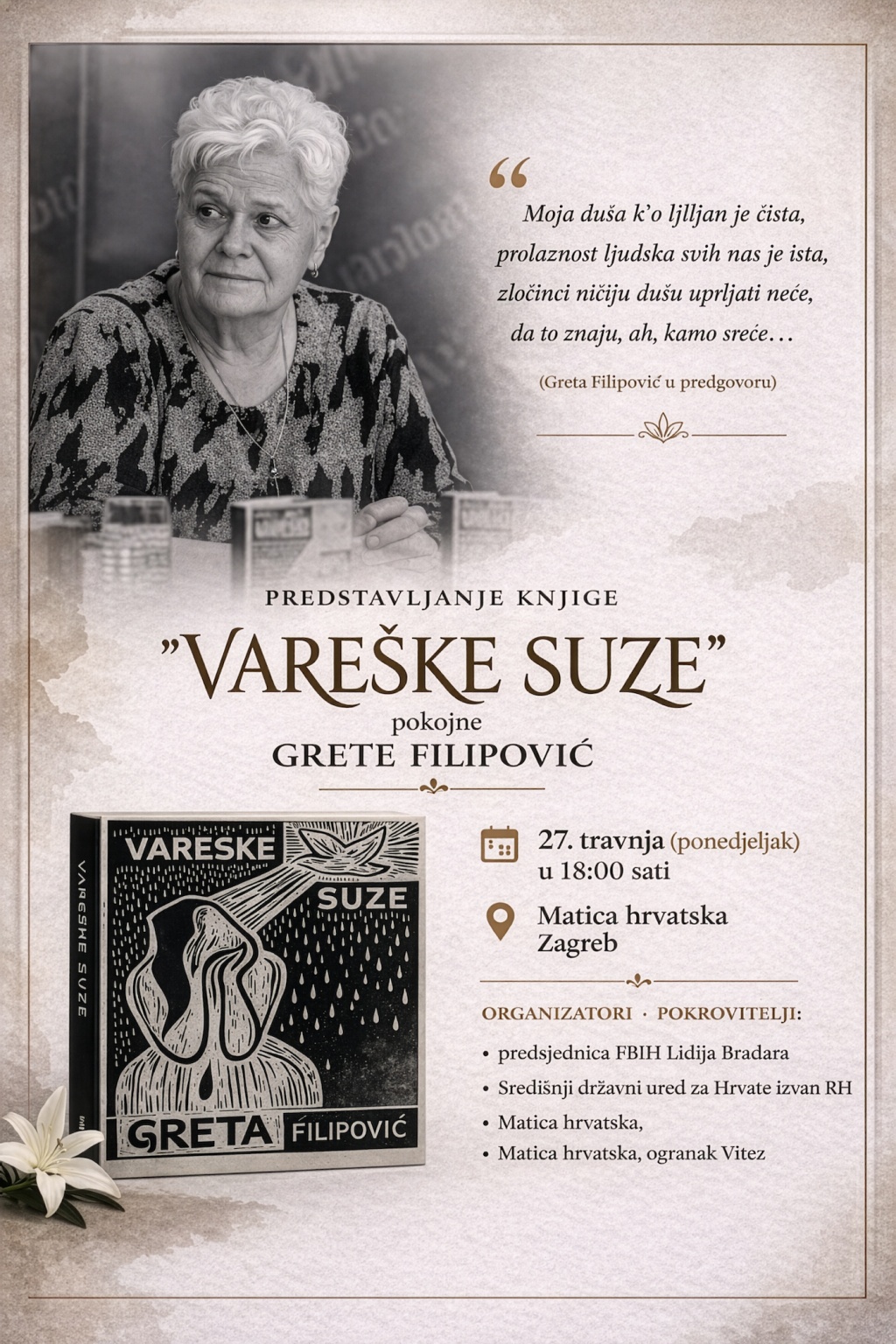 U organizaciji Matice hrvatske i njezina ogranka Vitez te uz pokroviteljstvo Središnjeg državnog ureda za Hrvate izvan Republike Hrvatske i predsjednice Federacije BiH Lidije Bradara, u Zagrebu će u ponedjeljak 27. travnja s početkom u 18:00 sati u dvorani Matice hrvatske (Ulica Matice hrvatske 2) biti upriličeno predstavljanje knjige "Vareške suze" pokojne Grete Filipović, izvijestili su organizatori.